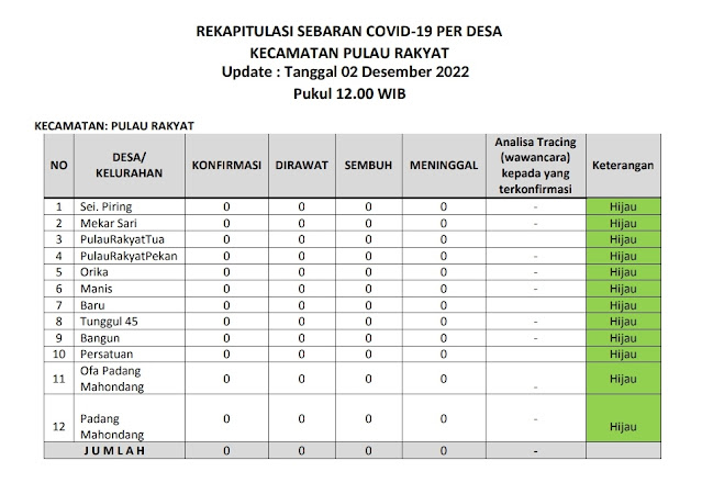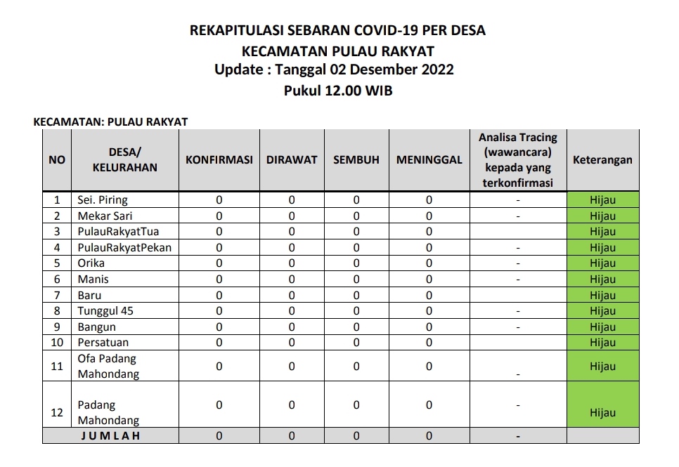 Kecamatan Pulau Rakyat berada dalam zona hijau sebaran covid 19 pada Jumat (2 Desember 2022). Hal ini terlihat dari tabel laporan harian sebaran covid 19 dari tiap desa di wilayah Kecamatan Pulau Rakyat. Jumlah terkonfirmasi 0 kasus, jumlah pasien dirawat 0 kasus, jumlah kasus sembuh 0 kasus dan jumlah meninggal dunia 0 kasus.