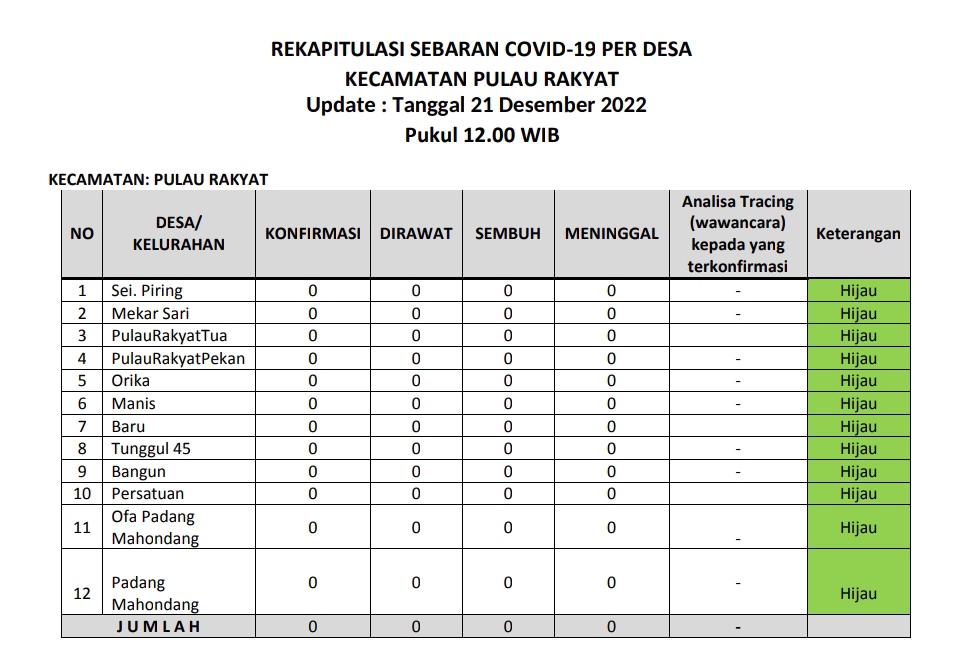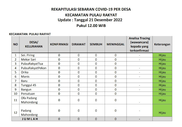 Kecamatan Pulau Rakyat berada dalam zona hijau sebaran covid 19 pada Rabu (21 Desember 2022). Hal ini terlihat dari tabel laporan harian sebaran covid 19 dari tiap desa di wilayah Kecamatan Pulau Rakyat. Jumlah terkonfirmasi 0 kasus, jumlah pasien dirawat 0 kasus, jumlah kasus sembuh 0 kasus dan jumlah meninggal dunia 0 kasus.