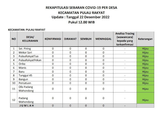 Kecamatan Pulau Rakyat berada dalam zona hijau sebaran covid 19 pada Kamis (22 Desember 2022). Hal ini terlihat dari tabel laporan harian sebaran covid 19 dari tiap desa di wilayah Kecamatan Pulau Rakyat. Jumlah terkonfirmasi 0 kasus, jumlah pasien dirawat 0 kasus, jumlah kasus sembuh 0 kasus dan jumlah meninggal dunia 0 kasus.