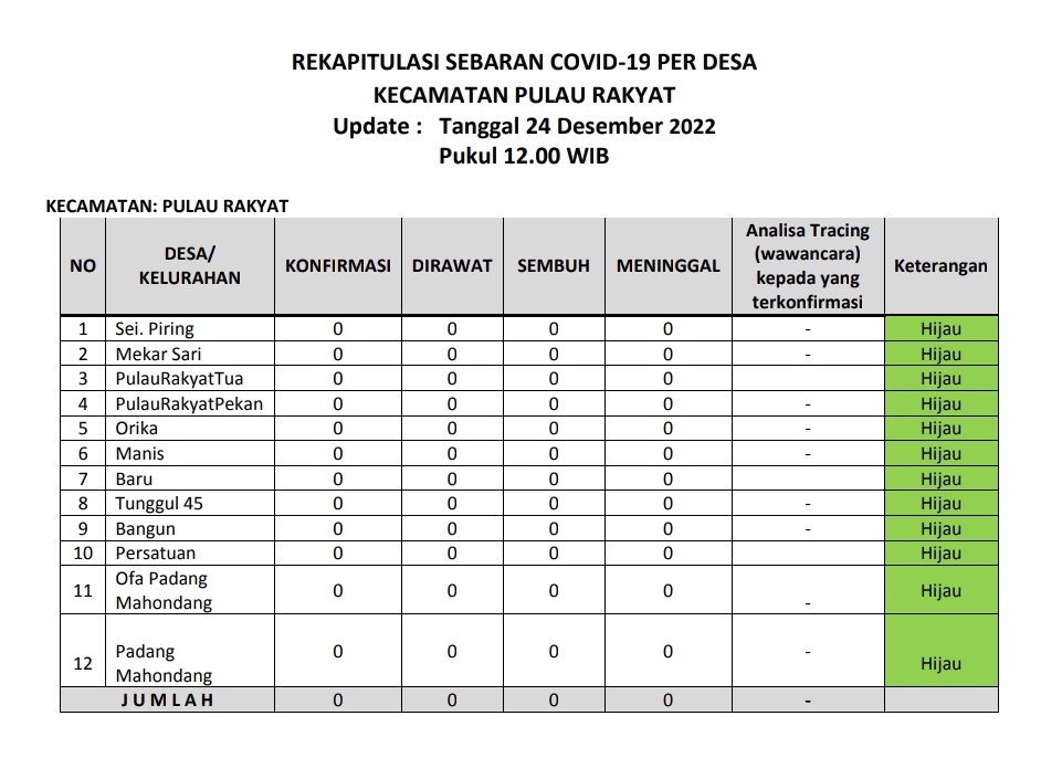 Kecamatan Pulau Rakyat berada dalam zona hijau sebaran covid 19 pada Sabtu (24 Desember 2022). Hal ini terlihat dari tabel laporan harian sebaran covid 19 dari tiap desa di wilayah Kecamatan Pulau Rakyat. Jumlah terkonfirmasi 0 kasus, jumlah pasien dirawat 0 kasus, jumlah kasus sembuh 0 kasus dan jumlah meninggal dunia 0 kasus.