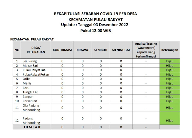 Kecamatan Pulau Rakyat berada dalam zona hijau sebaran covid 19 pada Sabtu (3 Desember 2022). Hal ini terlihat dari tabel laporan harian sebaran covid 19 dari tiap desa di wilayah Kecamatan Pulau Rakyat. Jumlah terkonfirmasi 0 kasus, jumlah pasien dirawat 0 kasus, jumlah kasus sembuh 0 kasus dan jumlah meninggal dunia 0 kasus.