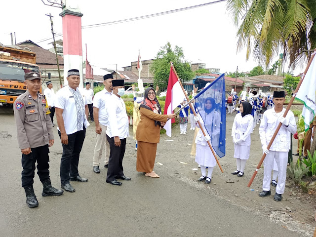 Sekretaris Kecamatan Pulau Rakyat Micam Sitorus, SH bersama perwakilan Kepala Desa Personel Bhabinkamtibmas lepas rombongan pawai ta'aruf MTQ dan Festival Seni Qasidah Tingkat Kecamatan Pulau Rakyat Tahun 2023, Senin (6/1/2023).