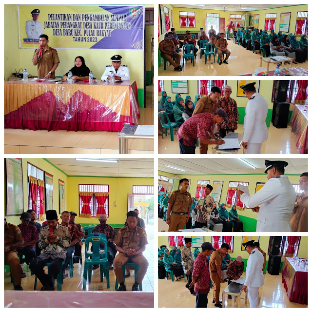 Kepala Desa Baru, Hajirun lantik Perangkat Desa Baru di Aula Kantor Desa Baru, Senin (13/03/2023).