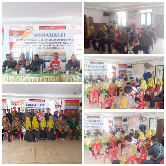 Dinas PMD Kabupaten Asahan melaksanakan sosialisasi tentang pengelolaan administrasi dan keuangan desa serta pemantapan tugas pokok dan fungsi aparatur pemerintahan desa di Aula Kantor Desa Pulau Rakyat Pekan, Jum'at (09/06/2023).