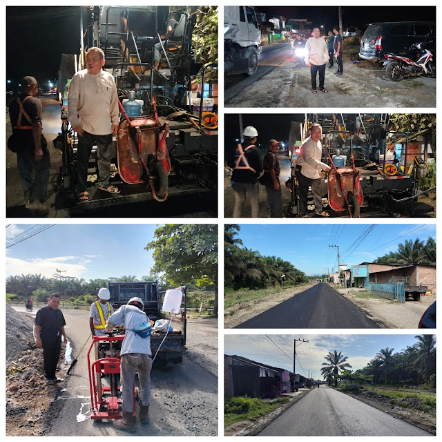 Pelaksana lapangan PT. Waskita melakukan pekerjaan hotmix Jalan Lintas Sigura-gura Desa Orika dan Desa Pulau Rakyat Pekan, Jum'at (07/07/2023).
