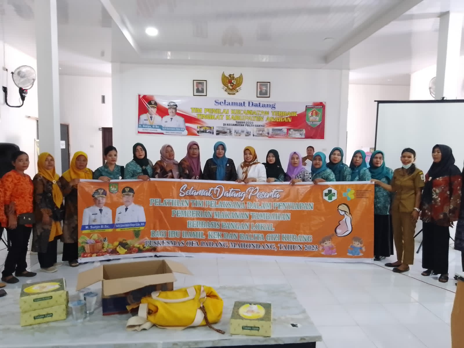 Puskesmas Ofa Padang Mahondang bersama Pemerintah Kecamatan Pulau Rakyat mengadakan pelatihan bagi Tim Pelaksana dalam Penyiapan Pemberian Makanan Tambahan Berbasis Pangan Lokal bagi Ibu Hamil KEK dan Balita Gizi Kurang Tahun 2023 di Aula Kantor Camat Pulau Rakyat, Selasa (22/08/2023).