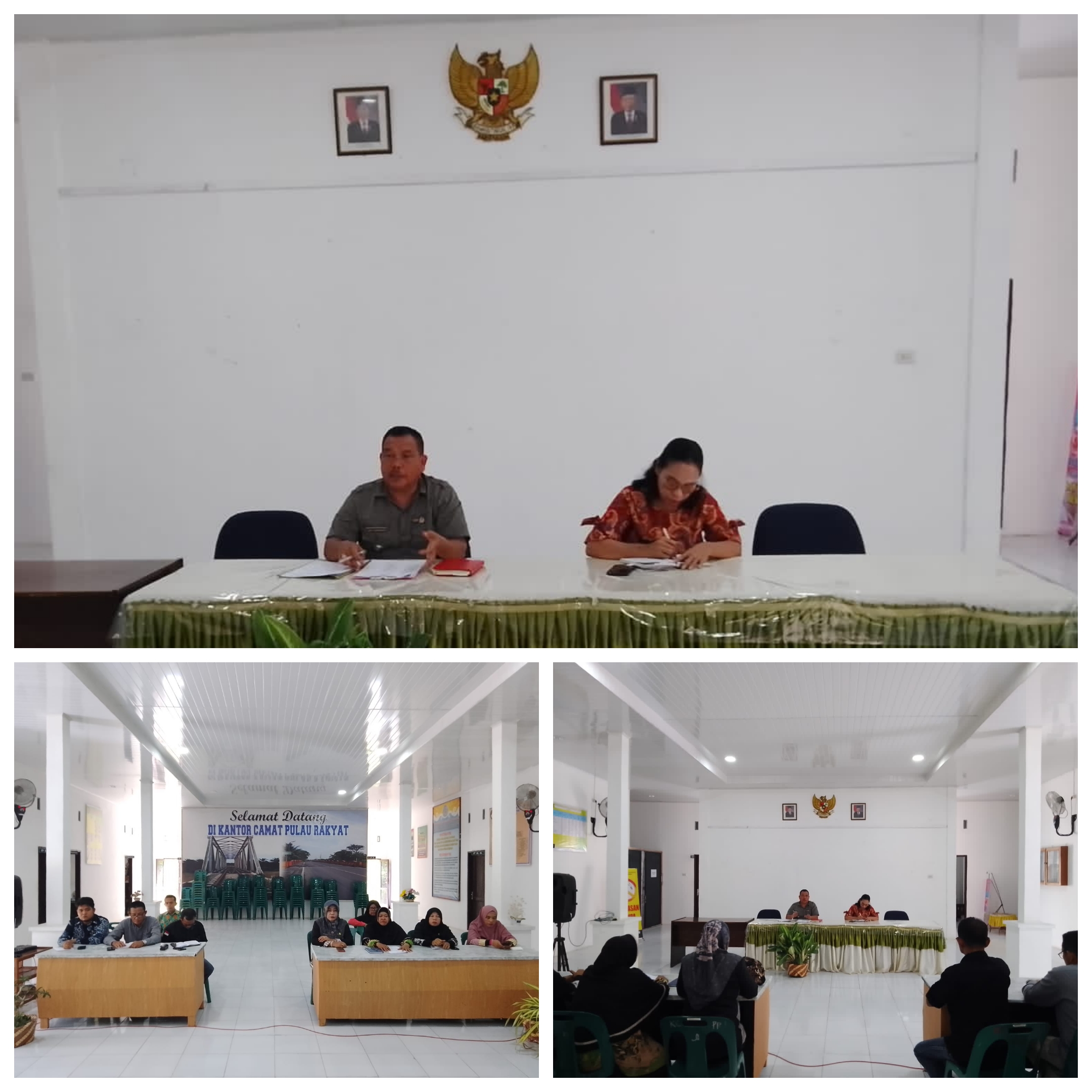 Camat Pulau Rakyat Haris Simargolang, SH bersama Sekretaris Camat Pulau Rakyat Dianty Elfirita Damanik, S.K.M., M.K.M. pimpin rapat koordinasi pegawai dan staf di Aula Kantor Camat Pulau Rakyat, Jum'at (29/09/2023).