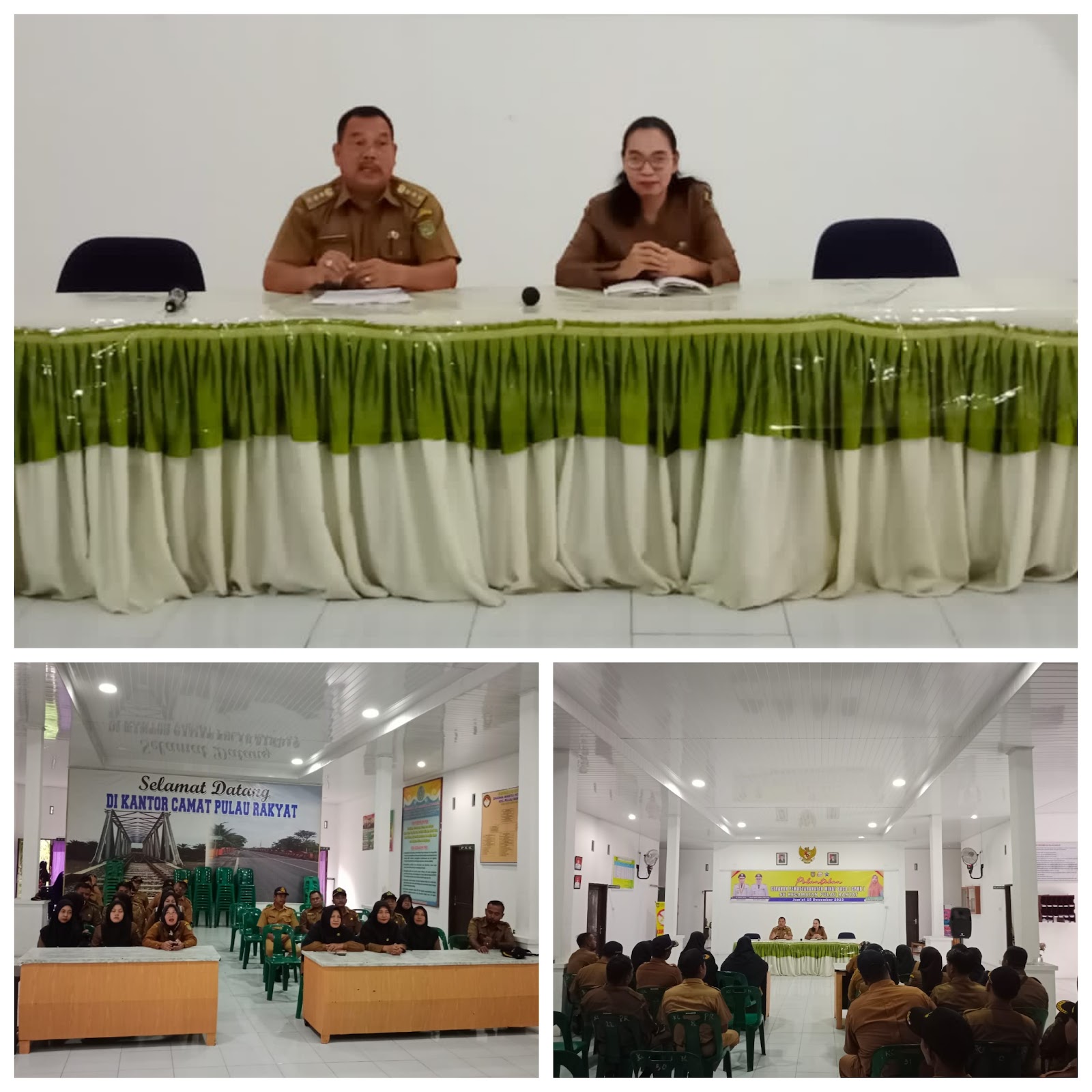 Camat Pulau Rakyat Haris Simargolang SH bersama Sekretaris Camat Pulau Rakyat Dianty Elfirita Damanik, S.K.M., M.K.M. pimpin Rapat Koordinasi Perangkat Desa di Aula Kantor Camat Pulau Rakyat, Senin (08/01/2024).