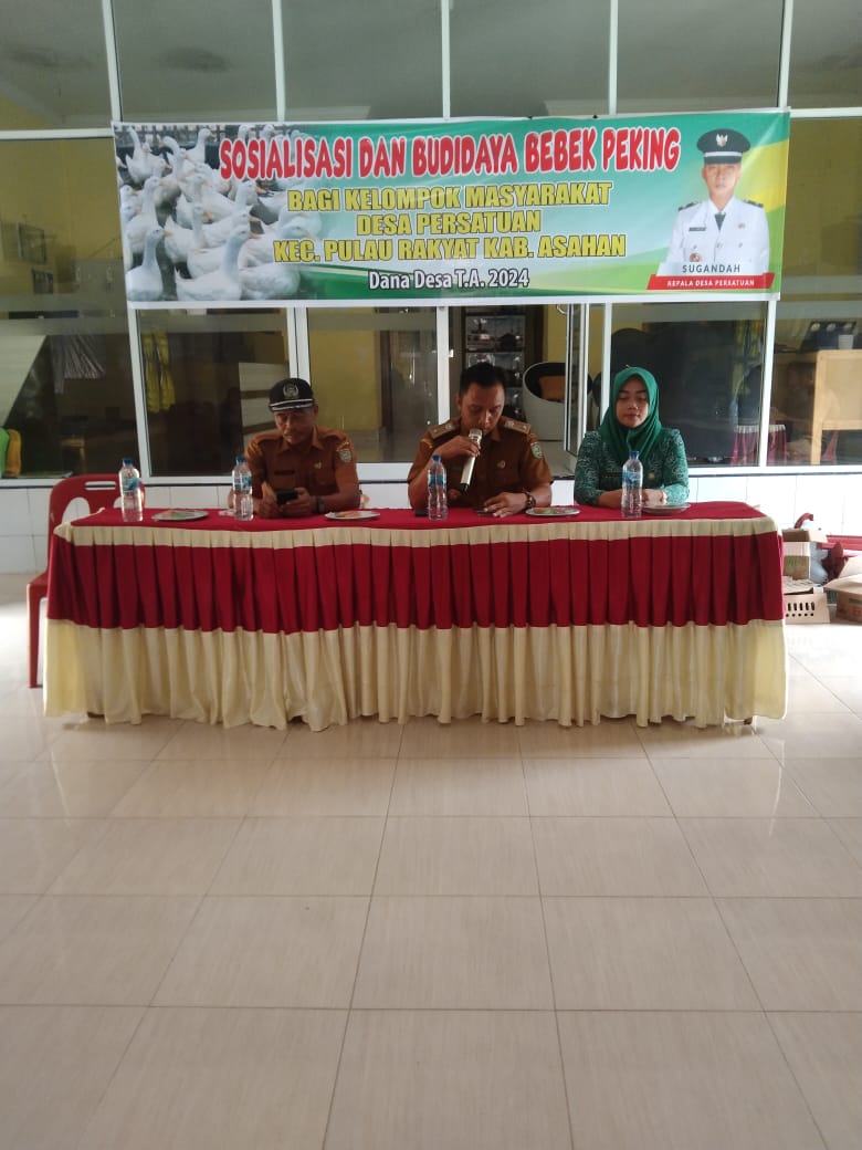 Kasi Pemerintahan Kecamatan Pulau Rakyat Amrinsyah menghadiri acara sosialisasi ternak bebek Peking dan pemberian bantuan bibit bebek peking bagi masyarakat di Aula Kantor Desa Persatuan, Selasa (21/05/2024).