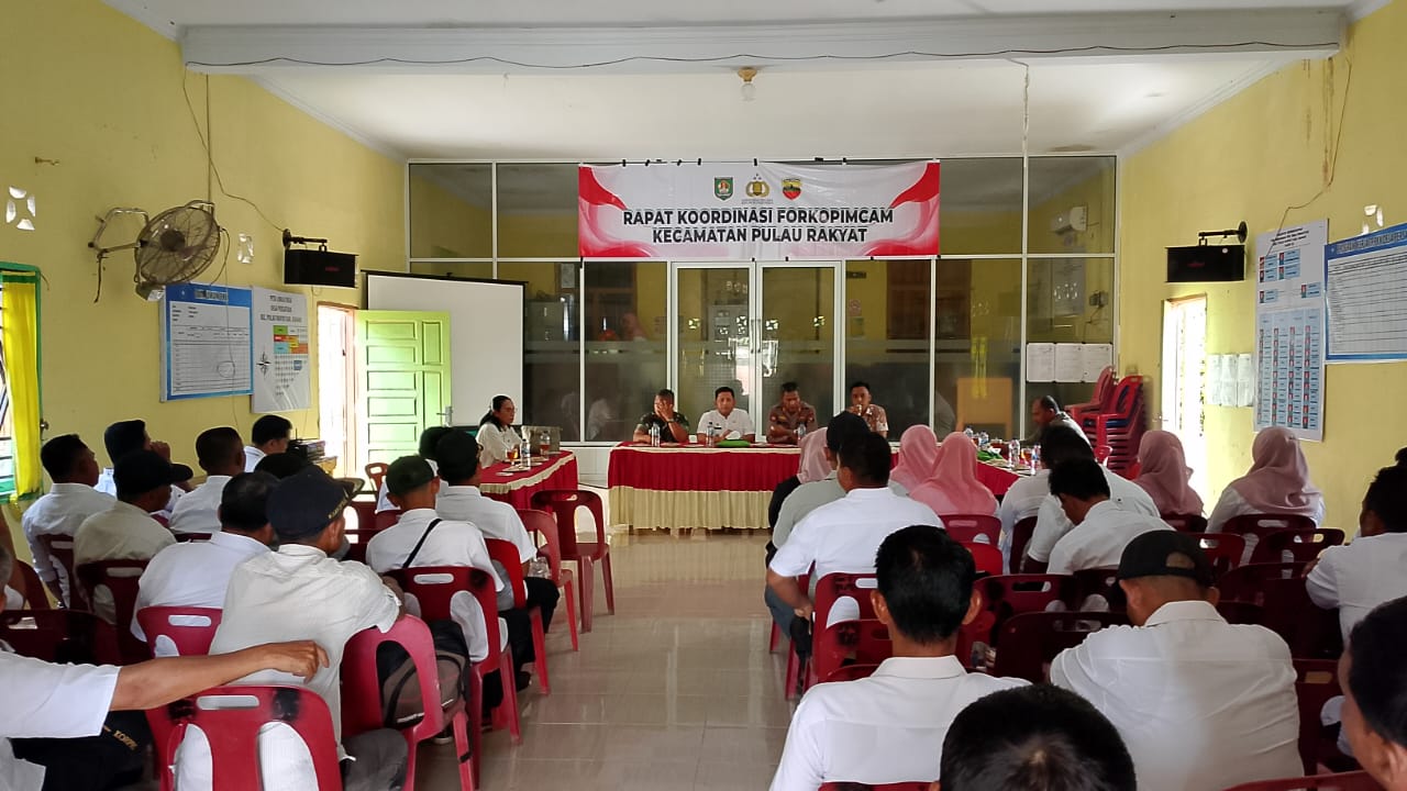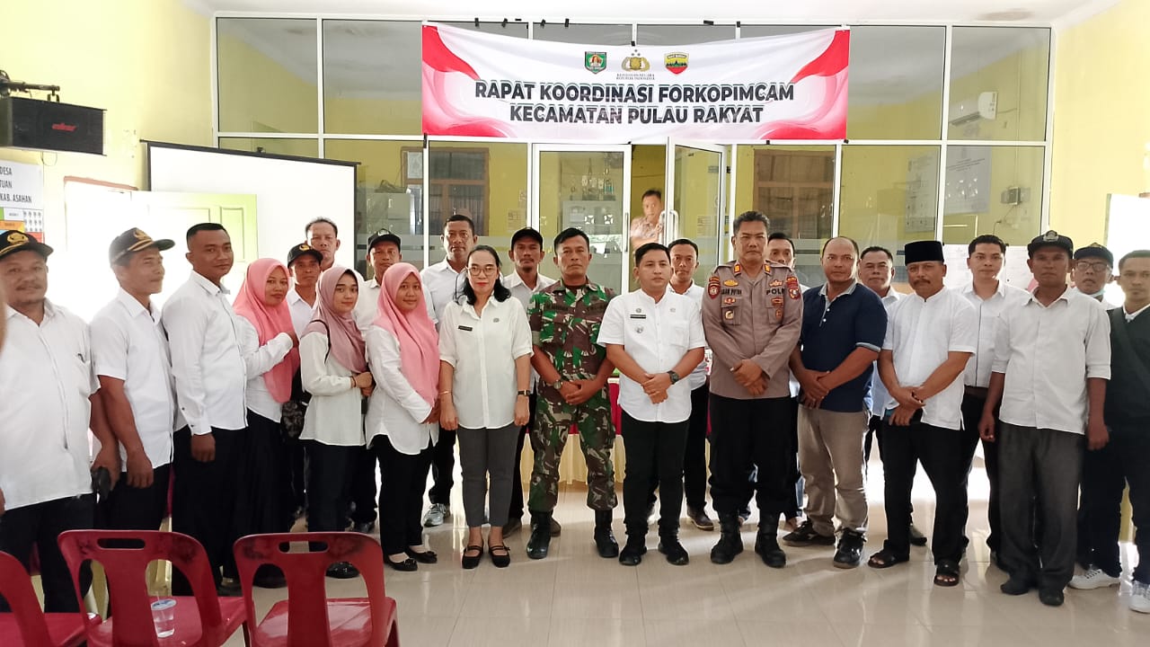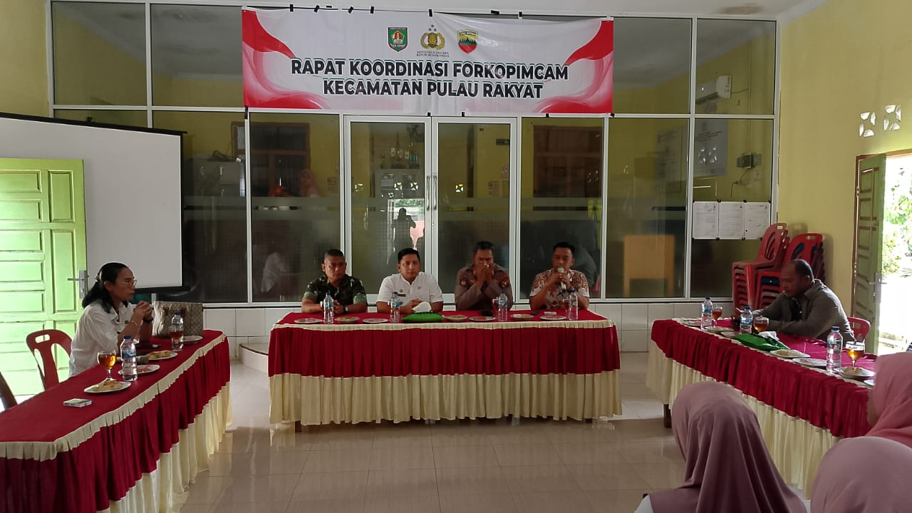 Pemerintah Kecamatan Pulau Rakyat bersama unsur Forkopimcam Pulau Rakyat melaksanakan kegiatan rapat koordinasi Forkopimcam Pulau Rakyat di Aula kantor desa Persatuan, Rabu (13 Nopember 2024).